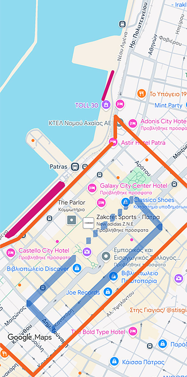 Ελεύθερο πάρκινγκ υπάρχει μόνον στον μόλο (χρωματισμένο με κόκκινο στον χάρτη που ακολουθεί), όπου παρκάρουμε τα αυτοκίνητα όταν επισκεπτόμαστε το κέντρο της πόλης. Ο χάρτης εκτείνεται από το Castello City Hotel (κάτω αριστερά) και την αίθουσα του Εμπορικού και Εισαγωγικού Συλλόγου Πατρών, όπου τα πραγματοποιηθεί το συνέδριο, έως το ξενοδοχείο Adonis City Hotel (προς τα πάνω δεξιά), το οποίο βρίσκεται ακριβώς δίπλα από τον υπεραστικό σταθμό των ΚΤΕΛ Ν. Αχαΐας.